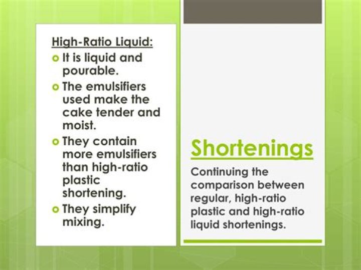 Liquid Shortening: Liquid fats, such as oil, cannot hold air. Liquid-type shortening is suggested for recipes that call for melted shortening, such as some cake and bread recipes. Vegetable shortening, unlike butter, can be used in frying as it has a relatively high smoke point.What is high ratio shortening used for?