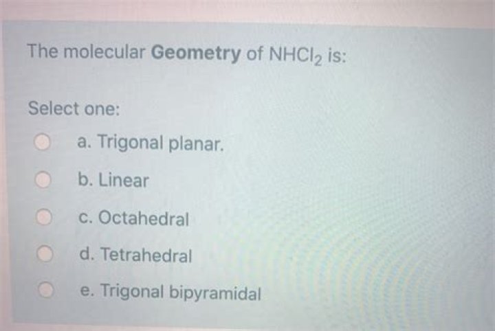 NHCl2 has hydrogen bonding becauseof the presence of N-H bond in addition to London forces. (b) Due to presence of hydrogen bonding which is a strong bond compared to dipole-dipole and London forces, NHCl2 is most likely to be in comdensed phase.What are the types of molecular geometry?